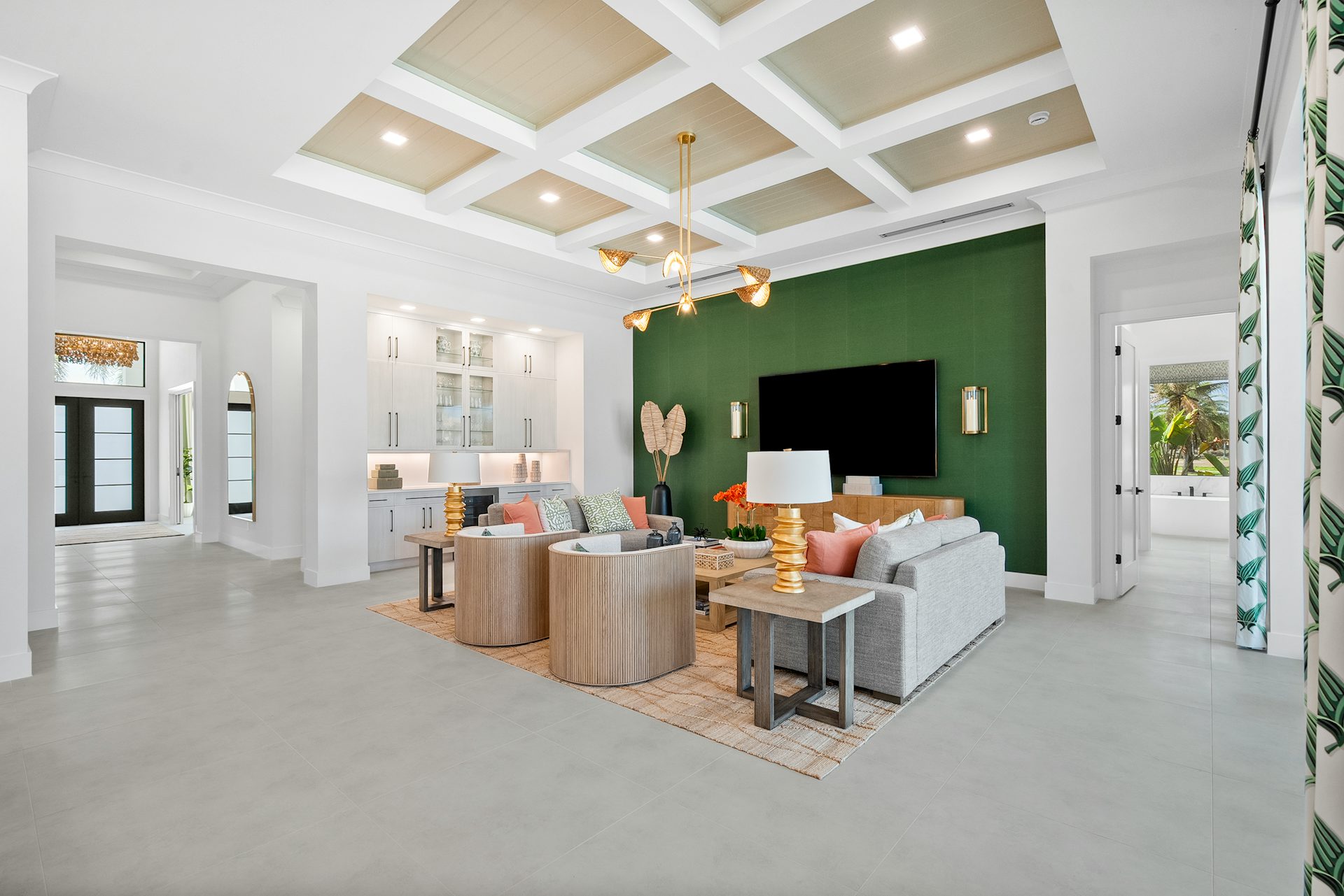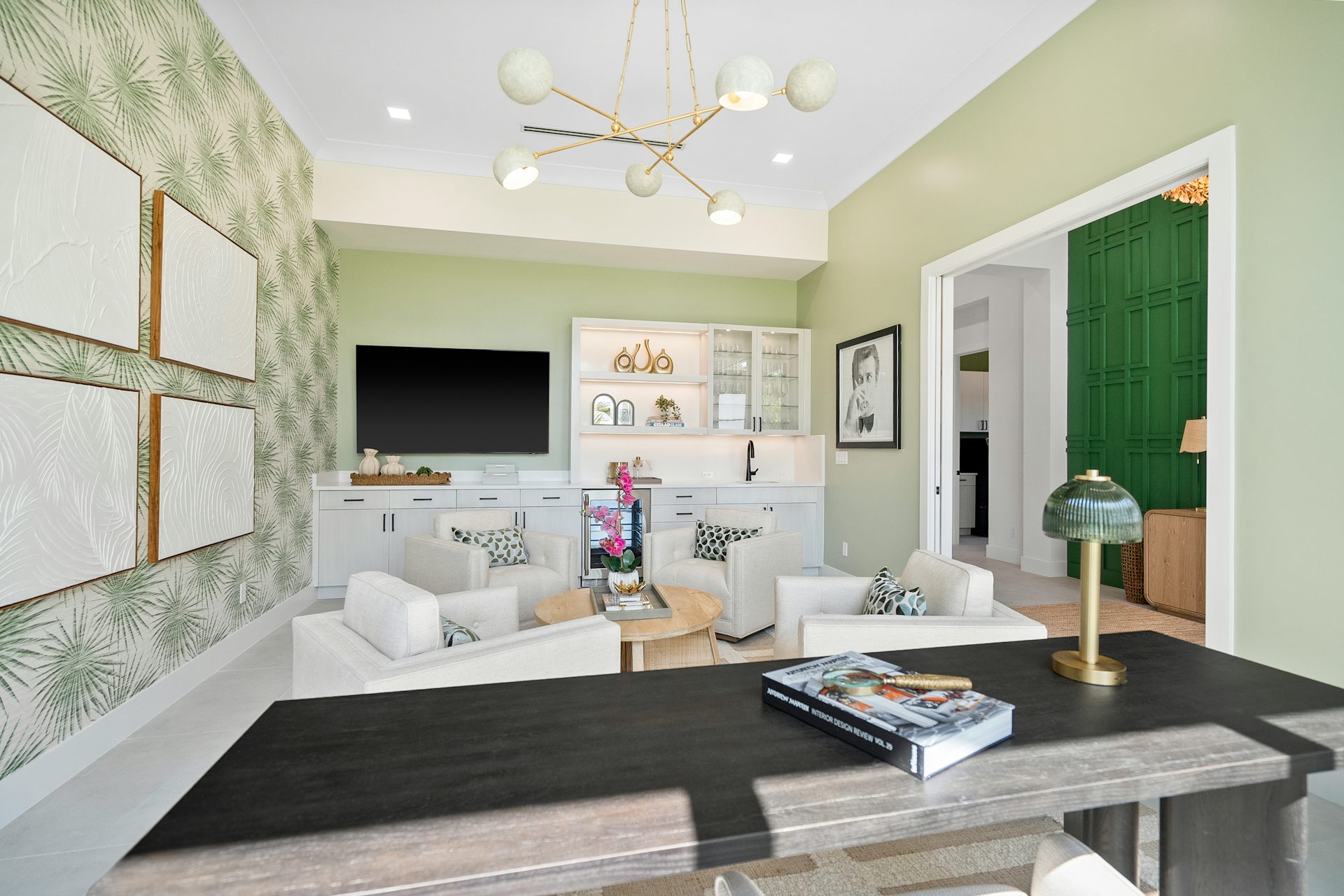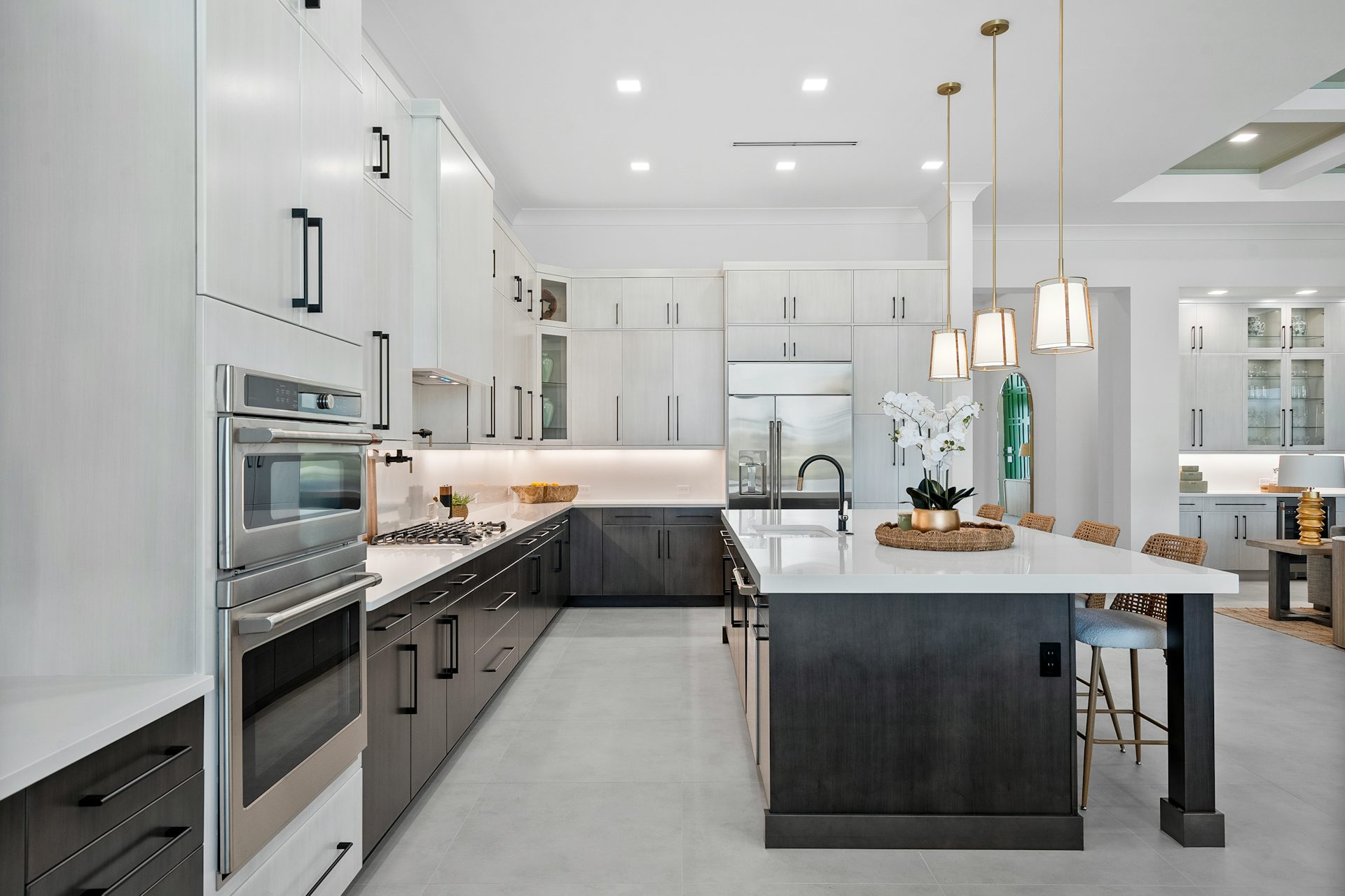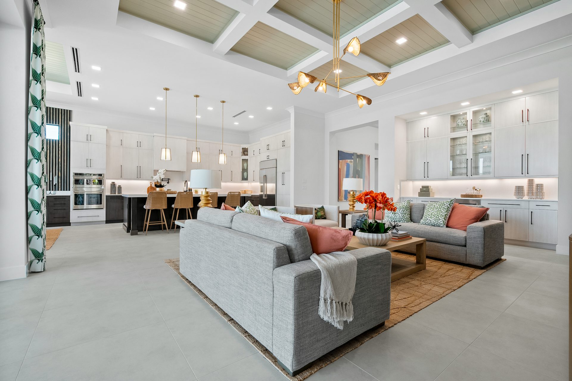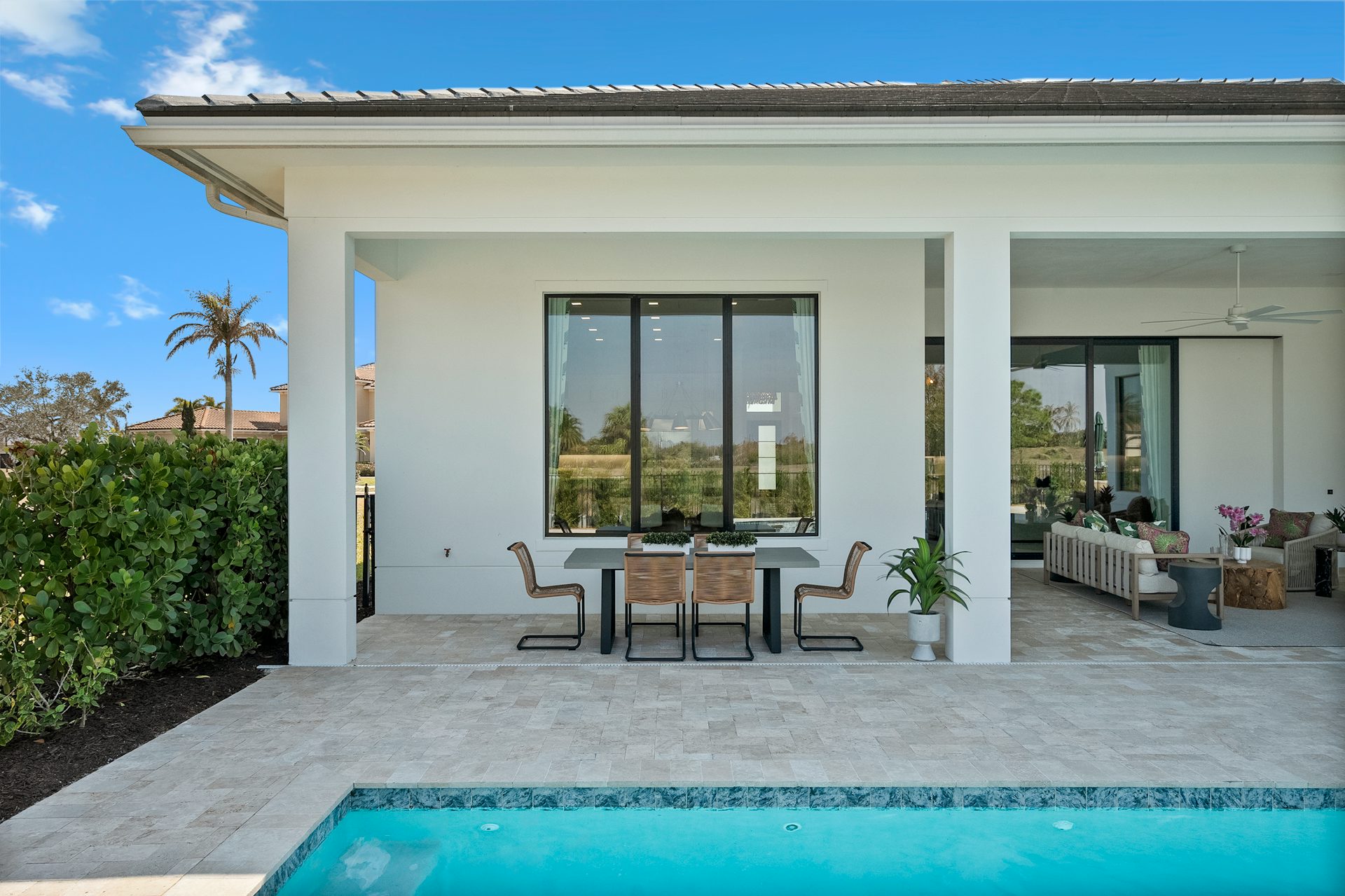 This coastal-contemporary semi-furnished home offers 3 bedrooms, 3.5 bathrooms and a 3-car split garage across 3,299 sq. ft. of air-conditioned space and 4,651 total sq. ft. The kitchen features a large center island with an extended breakfast bar, double-stacked white cabinetry, solid white quartz countertops, and premium Café appliances, including a 42" built-in refrigerator, wall oven/microwave combo, gas cooktop, and a hidden pantry. Soaring 12-ft. ceilings, a club room with wet bar and elegant 32x32 tile flooring throughout enhance the home's luxurious feel. The great room includes a built-in bar with upper and lower cabinetry and opens to a spacious lanai and pool deck with travertine pavers. The pool showcases a sun shelf and water feature.
