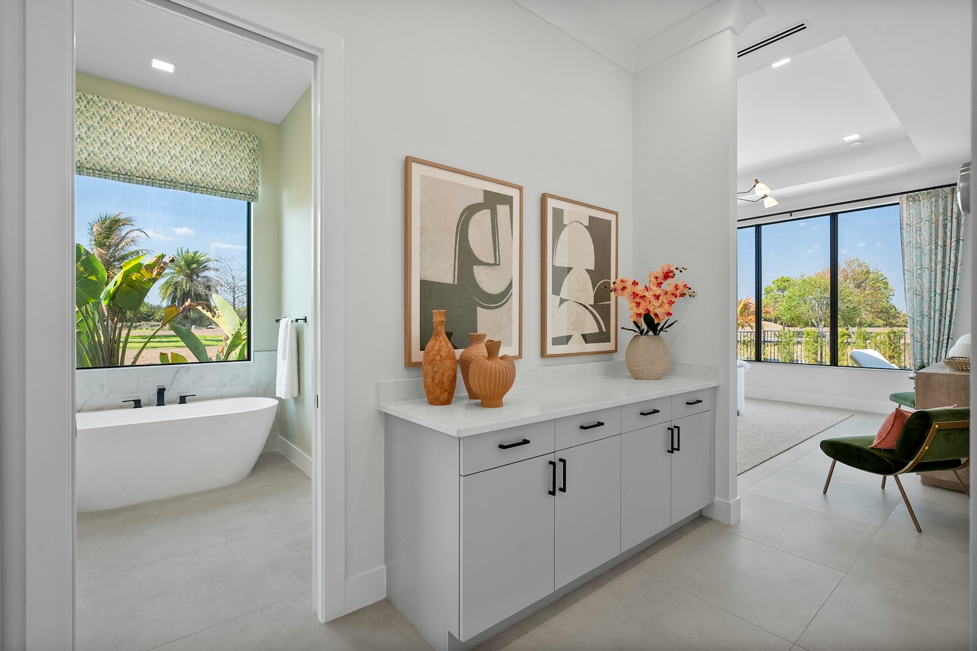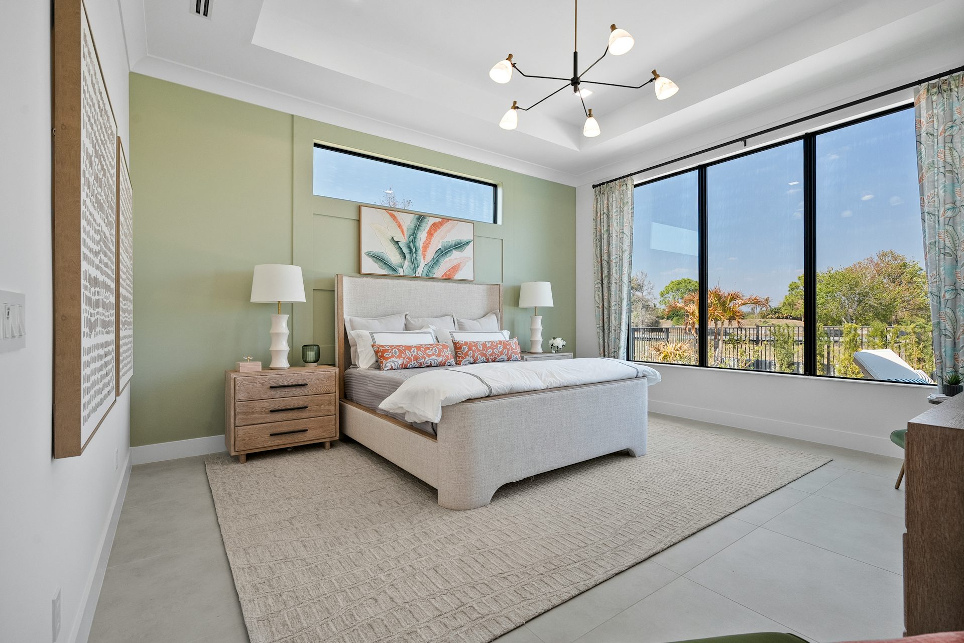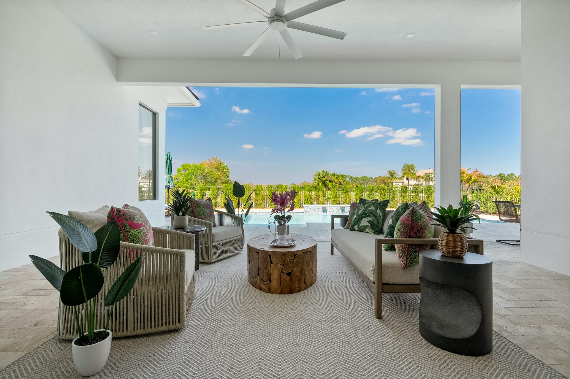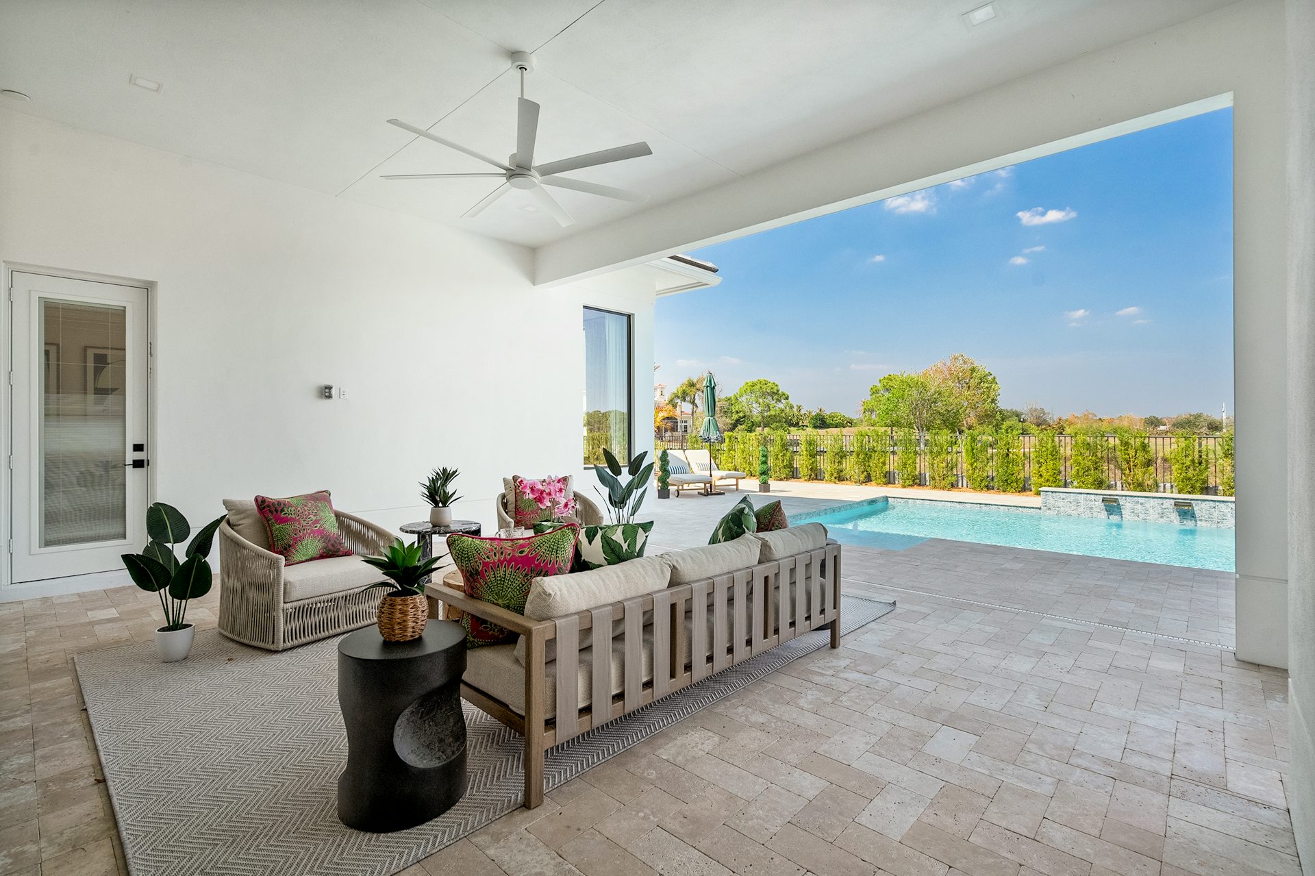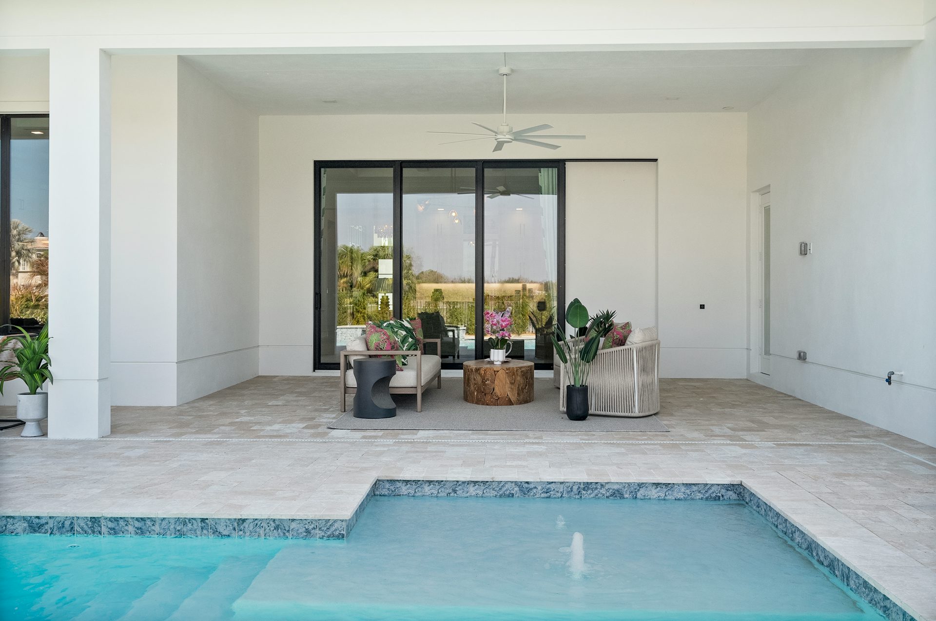 This coastal-contemporary semi-furnished home offers 3 bedrooms, 3.5 bathrooms and a 3-car split garage across 3,299 sq. ft. of air-conditioned space and 4,651 total sq. ft. The kitchen features a large center island with an extended breakfast bar, double-stacked white cabinetry, solid white quartz countertops, and premium Café appliances, including a 42" built-in refrigerator, wall oven/microwave combo, gas cooktop, and a hidden pantry. Soaring 12-ft. ceilings, a club room with wet bar and elegant 32x32 tile flooring throughout enhance the home's luxurious feel. The great room includes a built-in bar with upper and lower cabinetry and opens to a spacious lanai and pool deck with travertine pavers. The pool showcases a sun shelf and water feature.