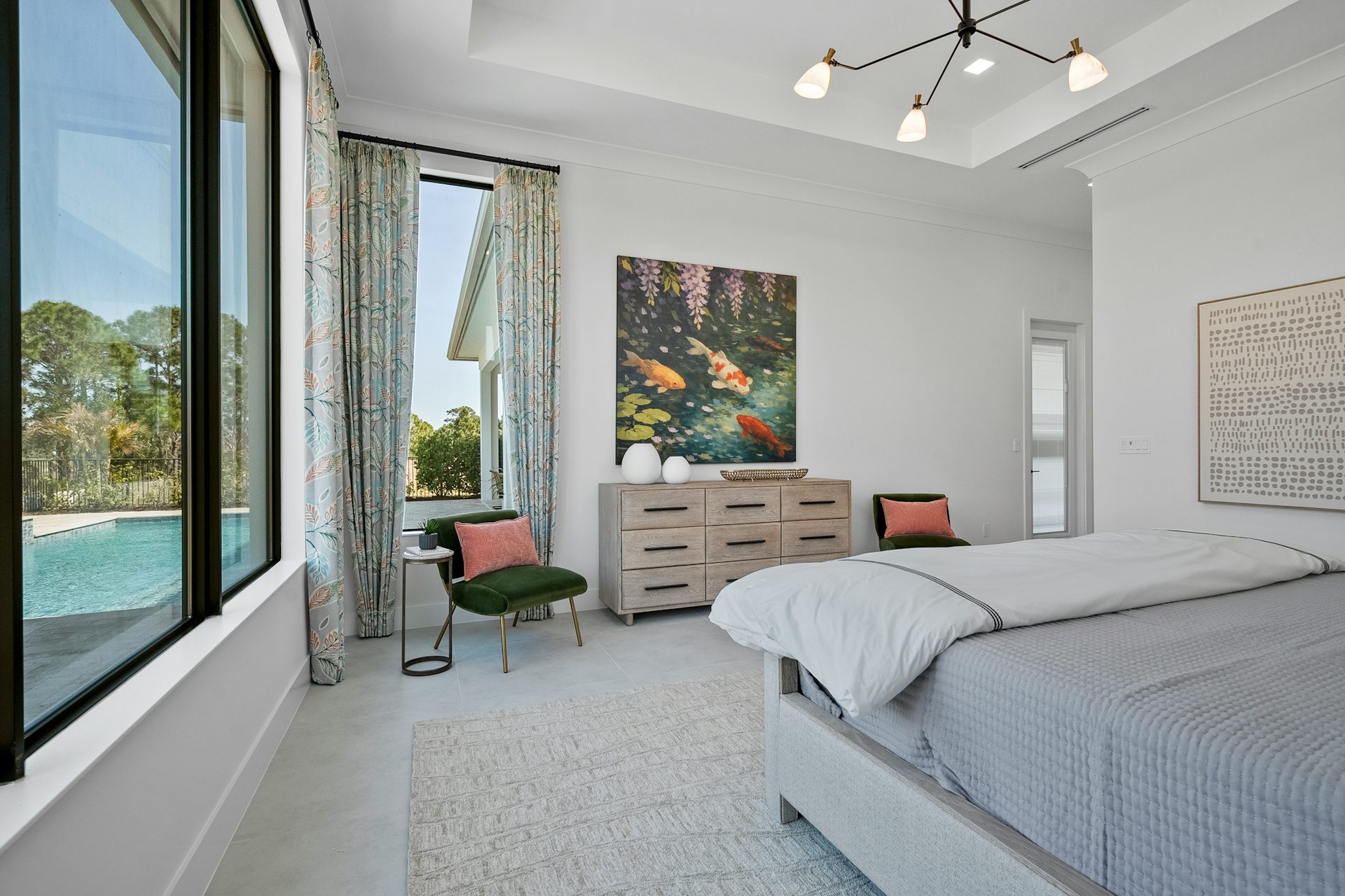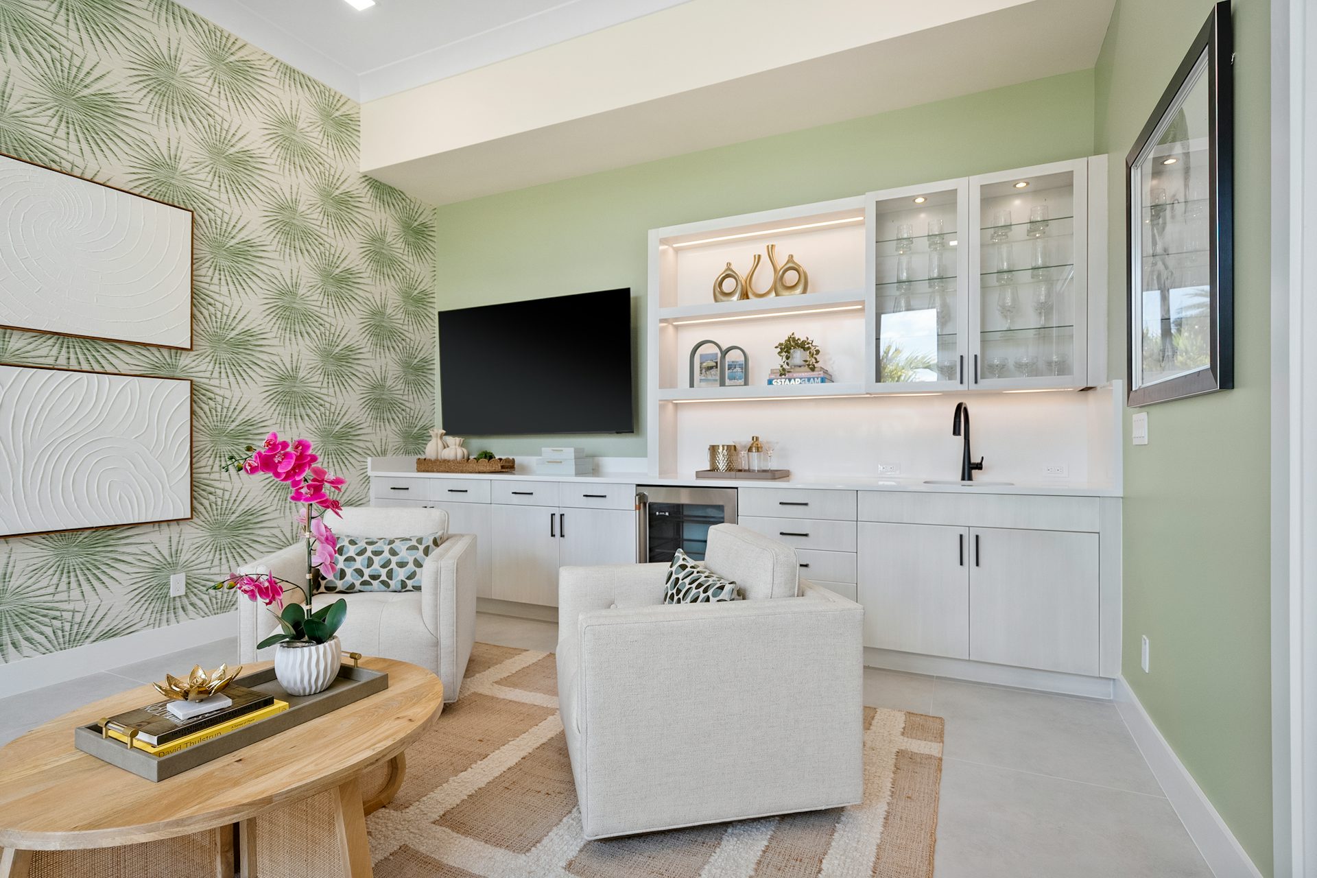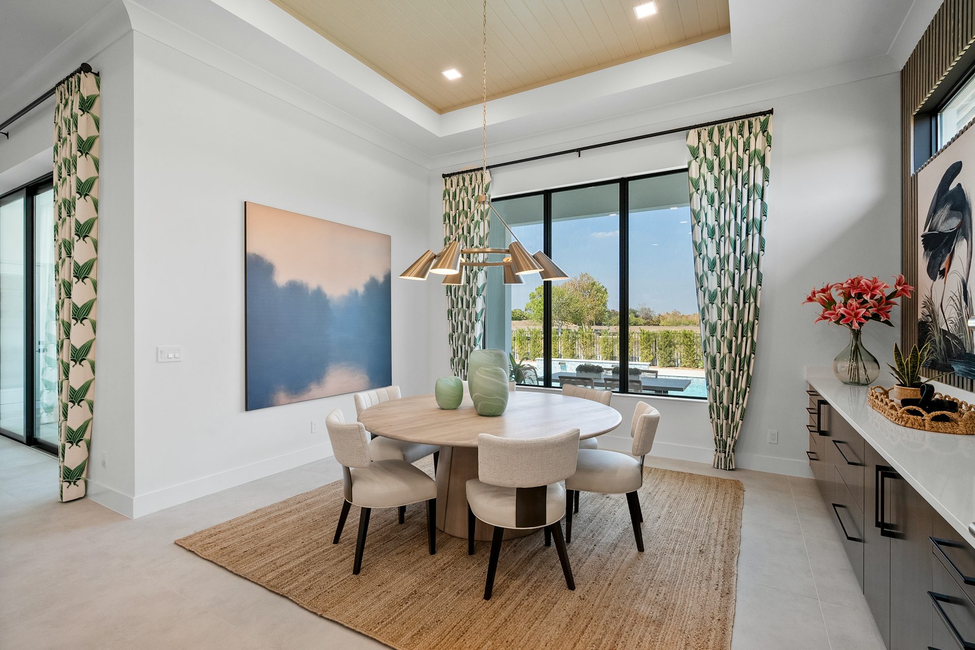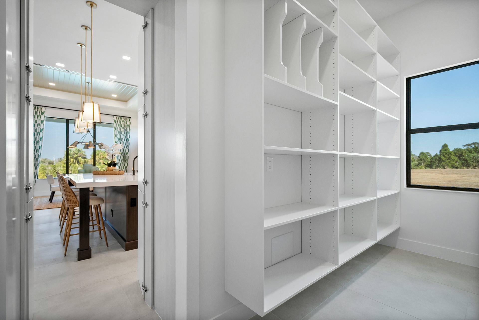 This coastal-contemporary semi-furnished home offers 3 bedrooms, 3.5 bathrooms and a 3-car split garage across 3,299 sq. ft. of air-conditioned space and 4,651 total sq. ft. The kitchen features a large center island with an extended breakfast bar, double-stacked white cabinetry, solid white quartz countertops, and premium Café appliances, including a 42" built-in refrigerator, wall oven/microwave combo, gas cooktop, and a hidden pantry. Soaring 12-ft. ceilings, a club room with wet bar and elegant 32x32 tile flooring throughout enhance the home's luxurious feel. The great room includes a built-in bar with upper and lower cabinetry and opens to a spacious lanai and pool deck with travertine pavers. The pool showcases a sun shelf and water feature.