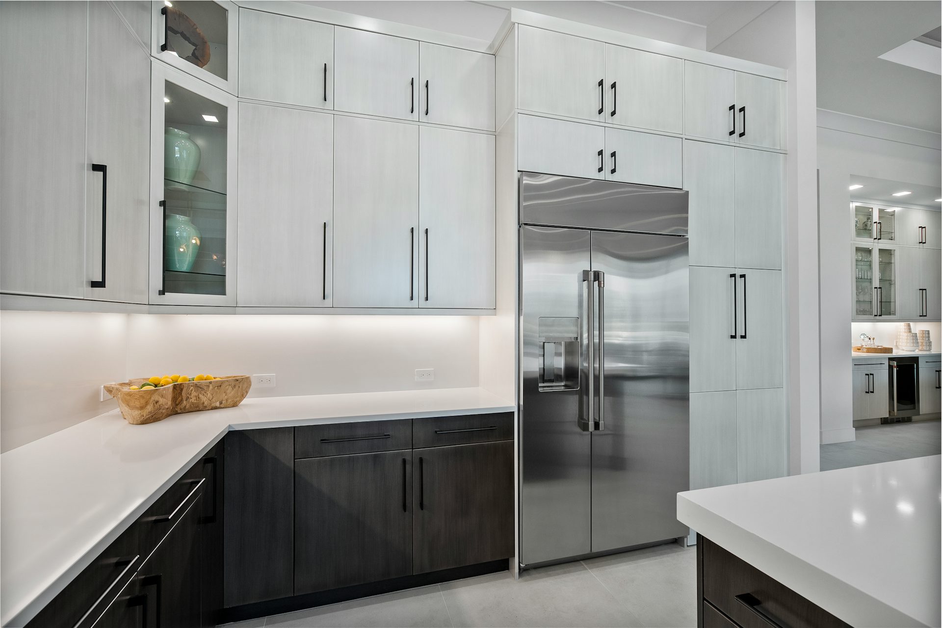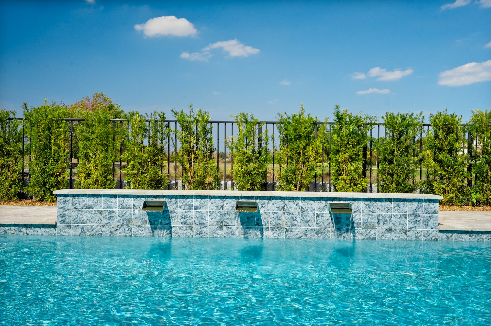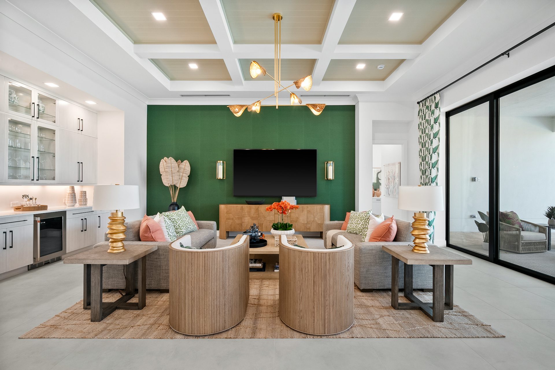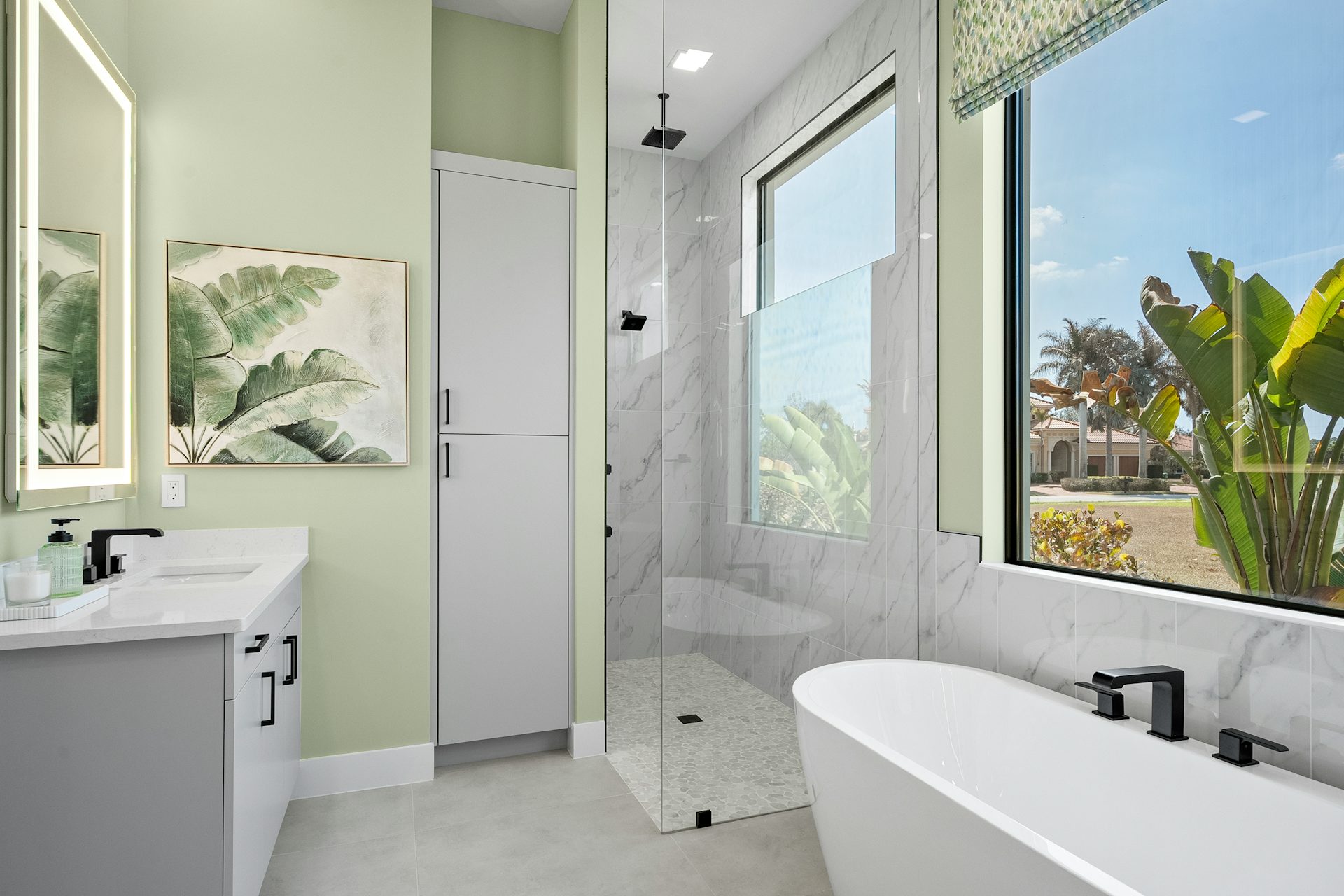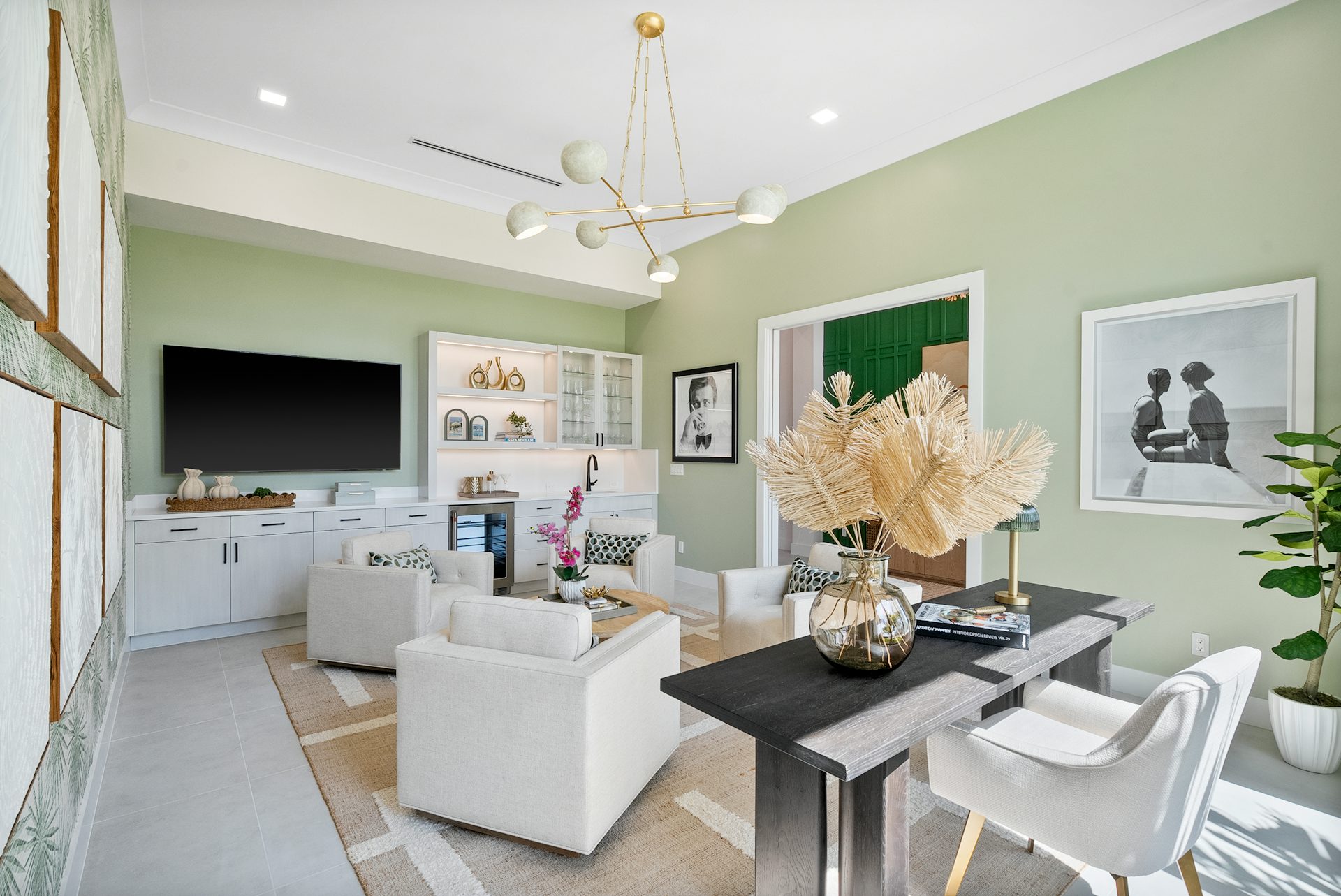 This coastal-contemporary semi-furnished home offers 3 bedrooms, 3.5 bathrooms and a 3-car split garage across 3,299 sq. ft. of air-conditioned space and 4,651 total sq. ft. The kitchen features a large center island with an extended breakfast bar, double-stacked white cabinetry, solid white quartz countertops, and premium Café appliances, including a 42" built-in refrigerator, wall oven/microwave combo, gas cooktop, and a hidden pantry. Soaring 12-ft. ceilings, a club room with wet bar and elegant 32x32 tile flooring throughout enhance the home's luxurious feel. The great room includes a built-in bar with upper and lower cabinetry and opens to a spacious lanai and pool deck with travertine pavers. The pool showcases a sun shelf and water feature.