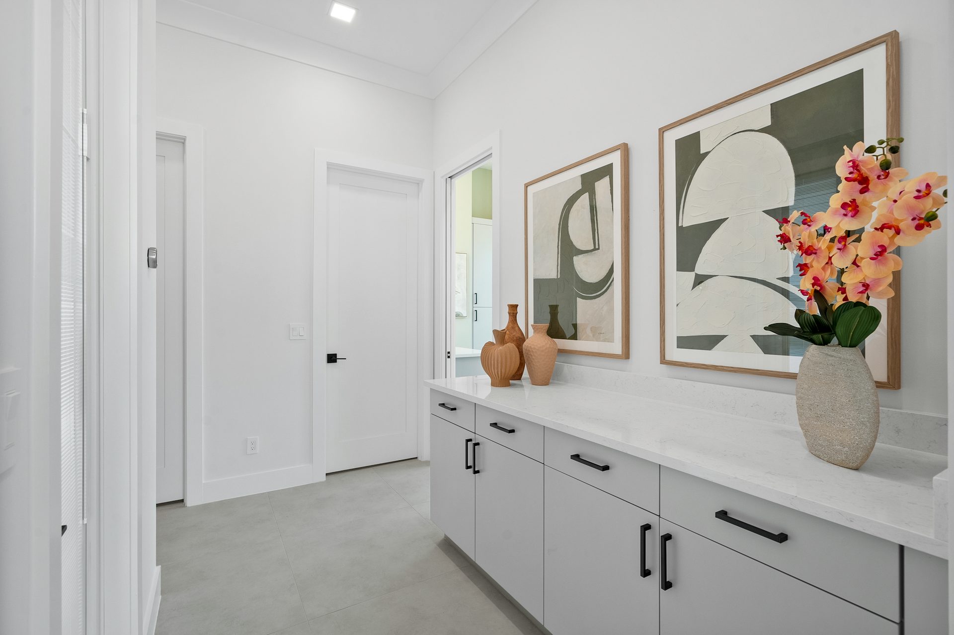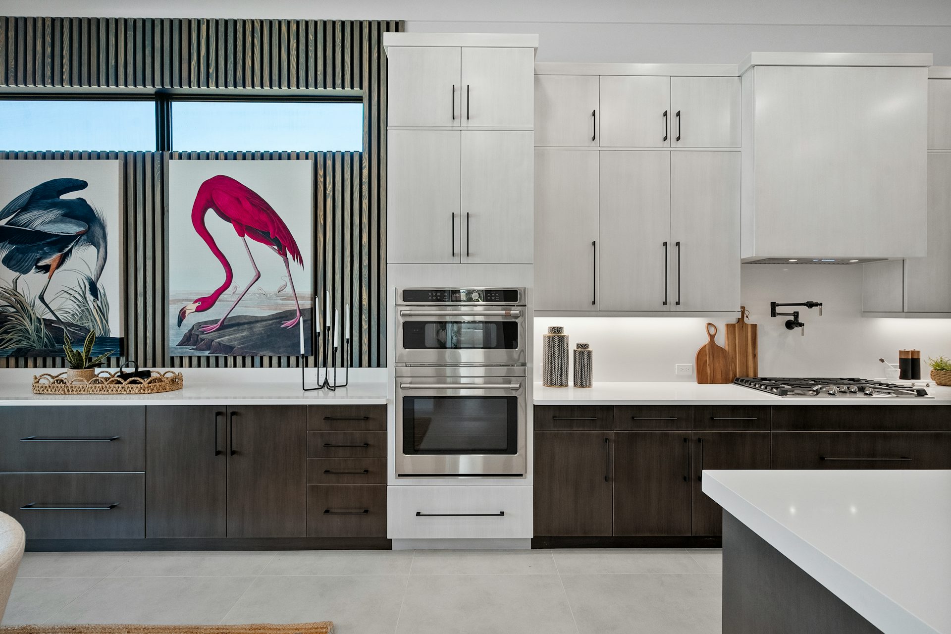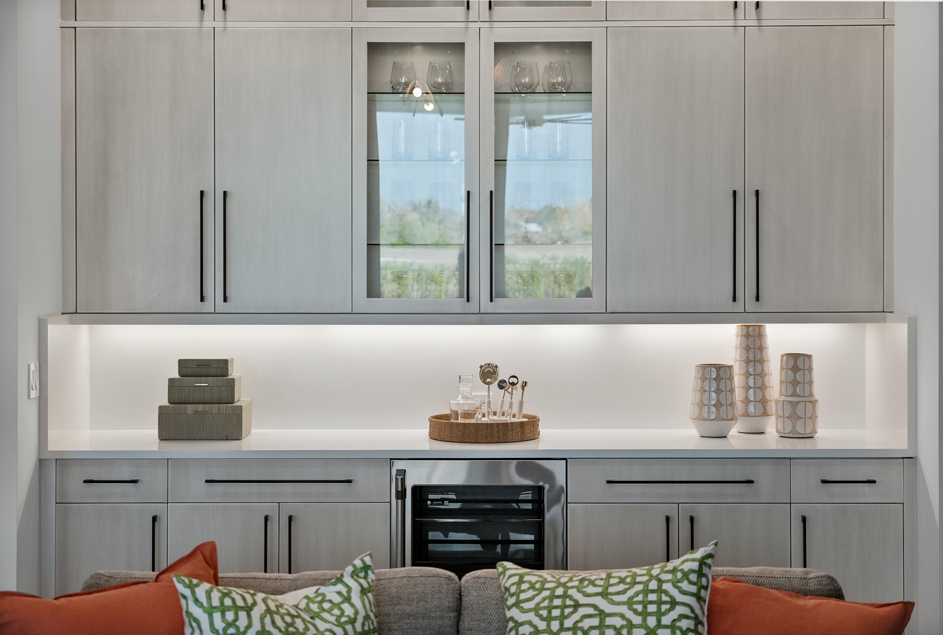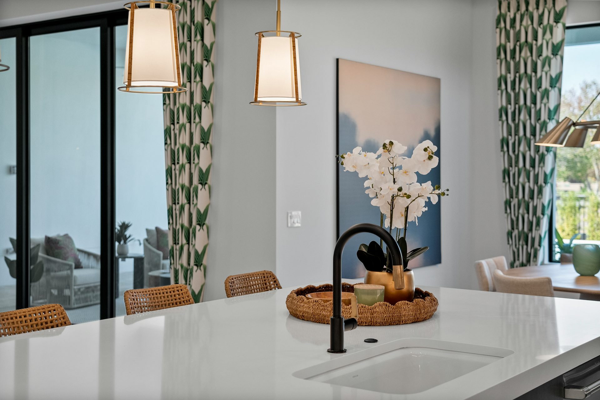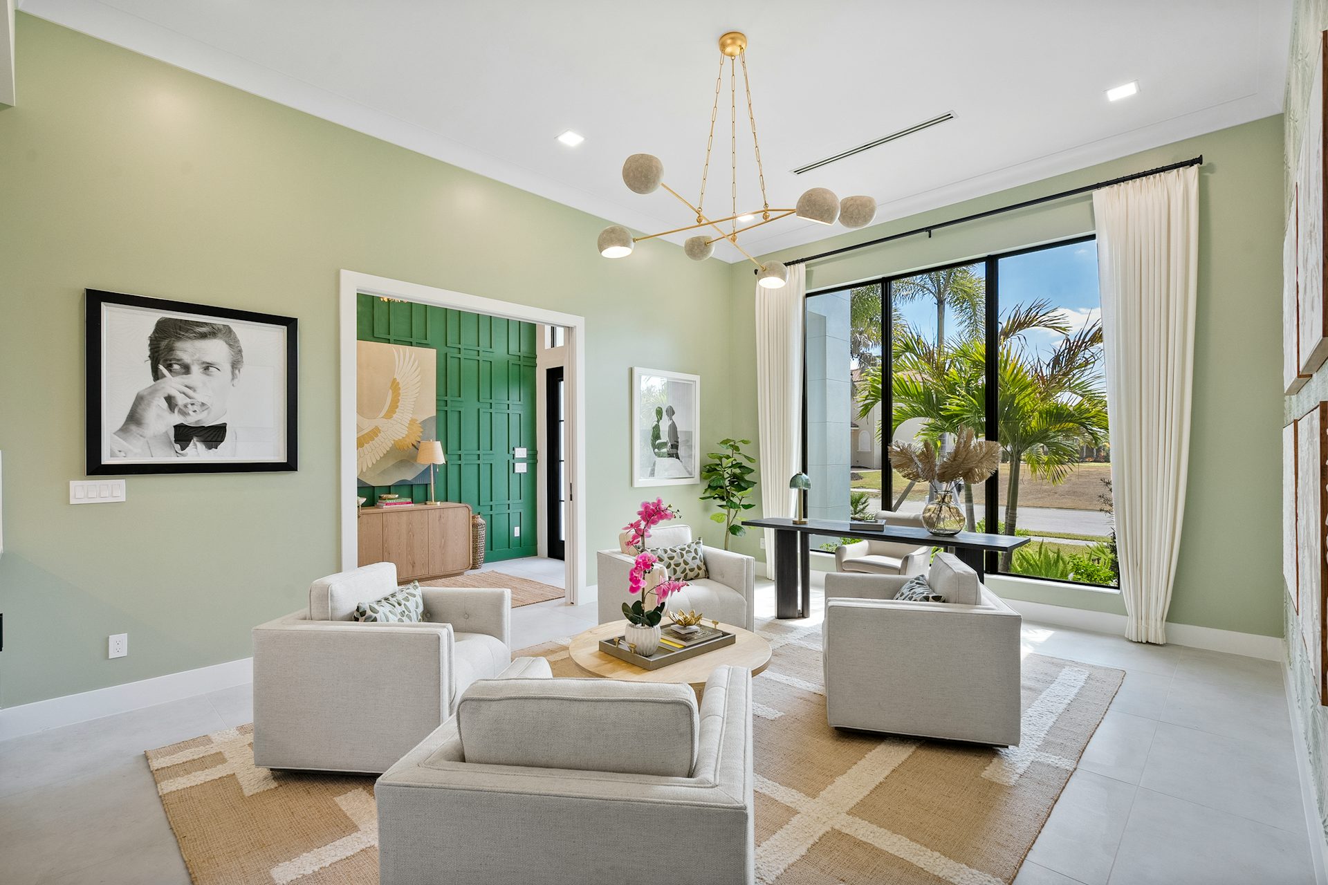 This coastal-contemporary semi-furnished home offers 3 bedrooms, 3.5 bathrooms and a 3-car split garage across 3,299 sq. ft. of air-conditioned space and 4,651 total sq. ft. The kitchen features a large center island with an extended breakfast bar, double-stacked white cabinetry, solid white quartz countertops, and premium Café appliances, including a 42" built-in refrigerator, wall oven/microwave combo, gas cooktop, and a hidden pantry. Soaring 12-ft. ceilings, a club room with wet bar and elegant 32x32 tile flooring throughout enhance the home's luxurious feel. The great room includes a built-in bar with upper and lower cabinetry and opens to a spacious lanai and pool deck with travertine pavers. The pool showcases a sun shelf and water feature.