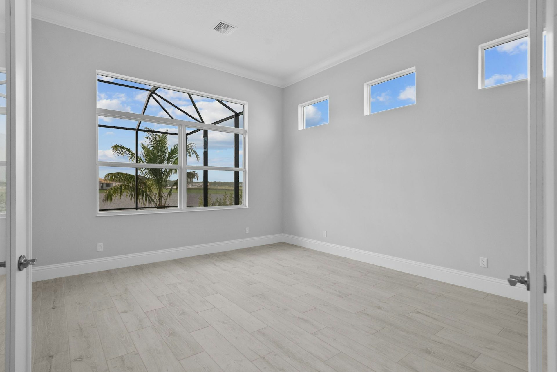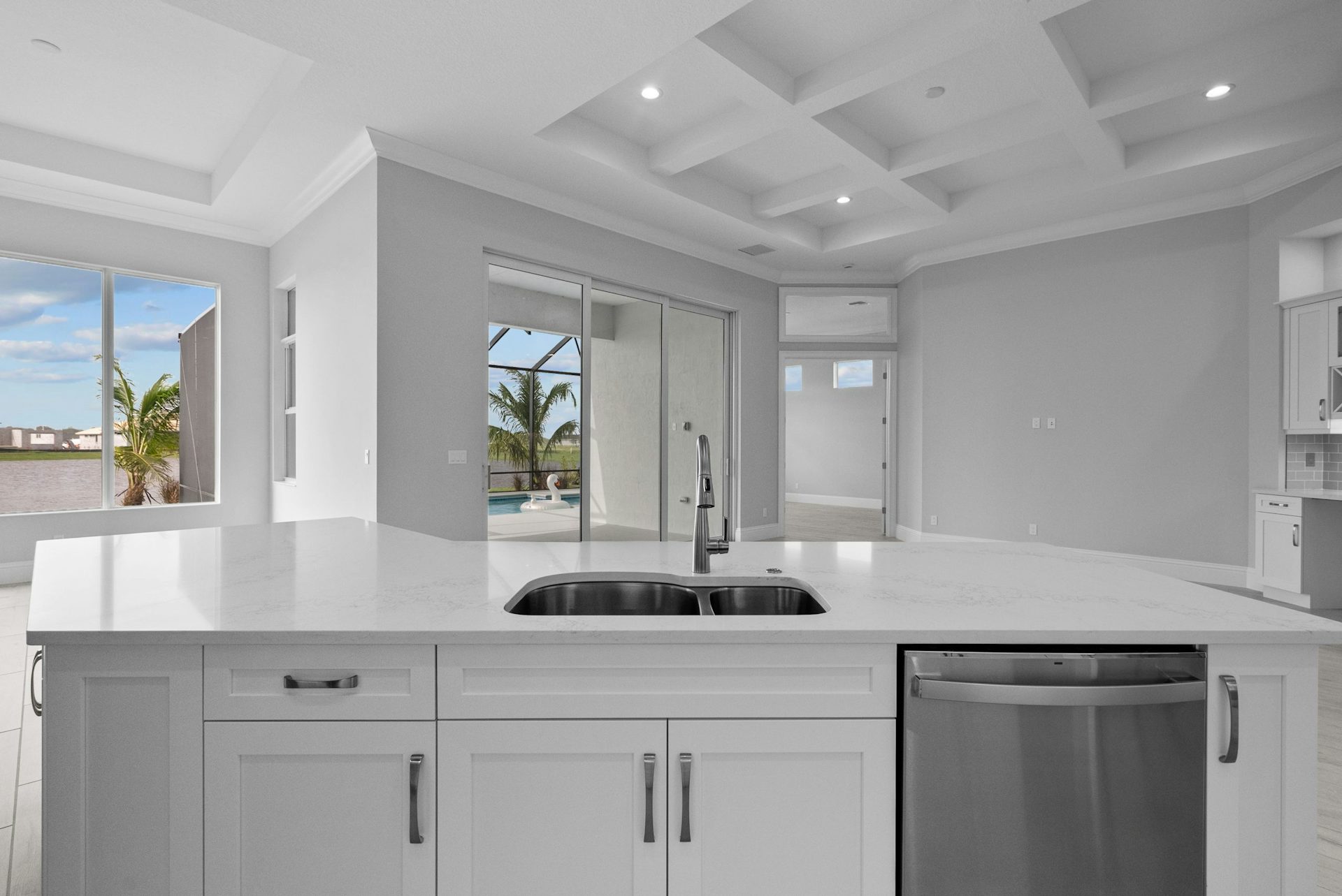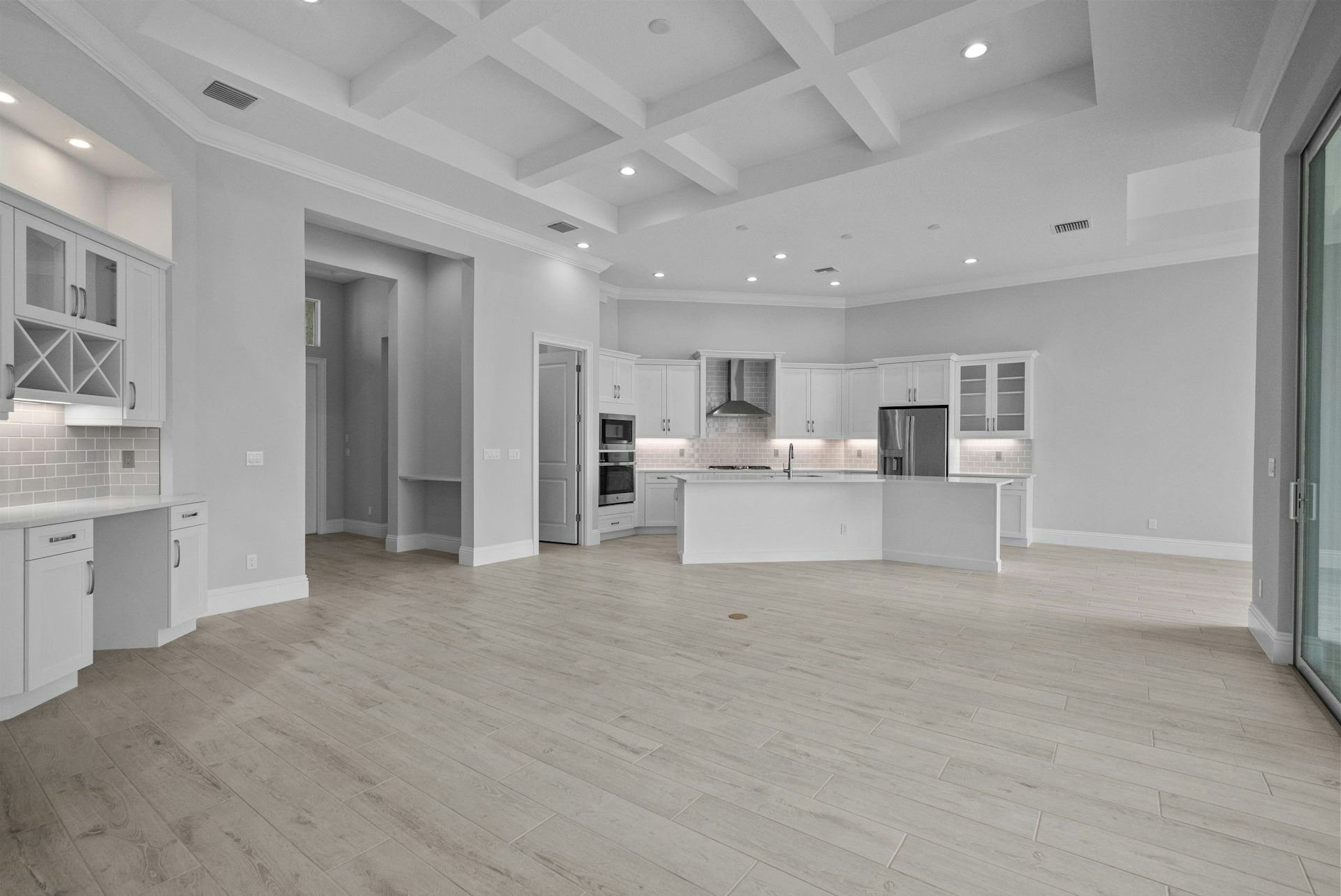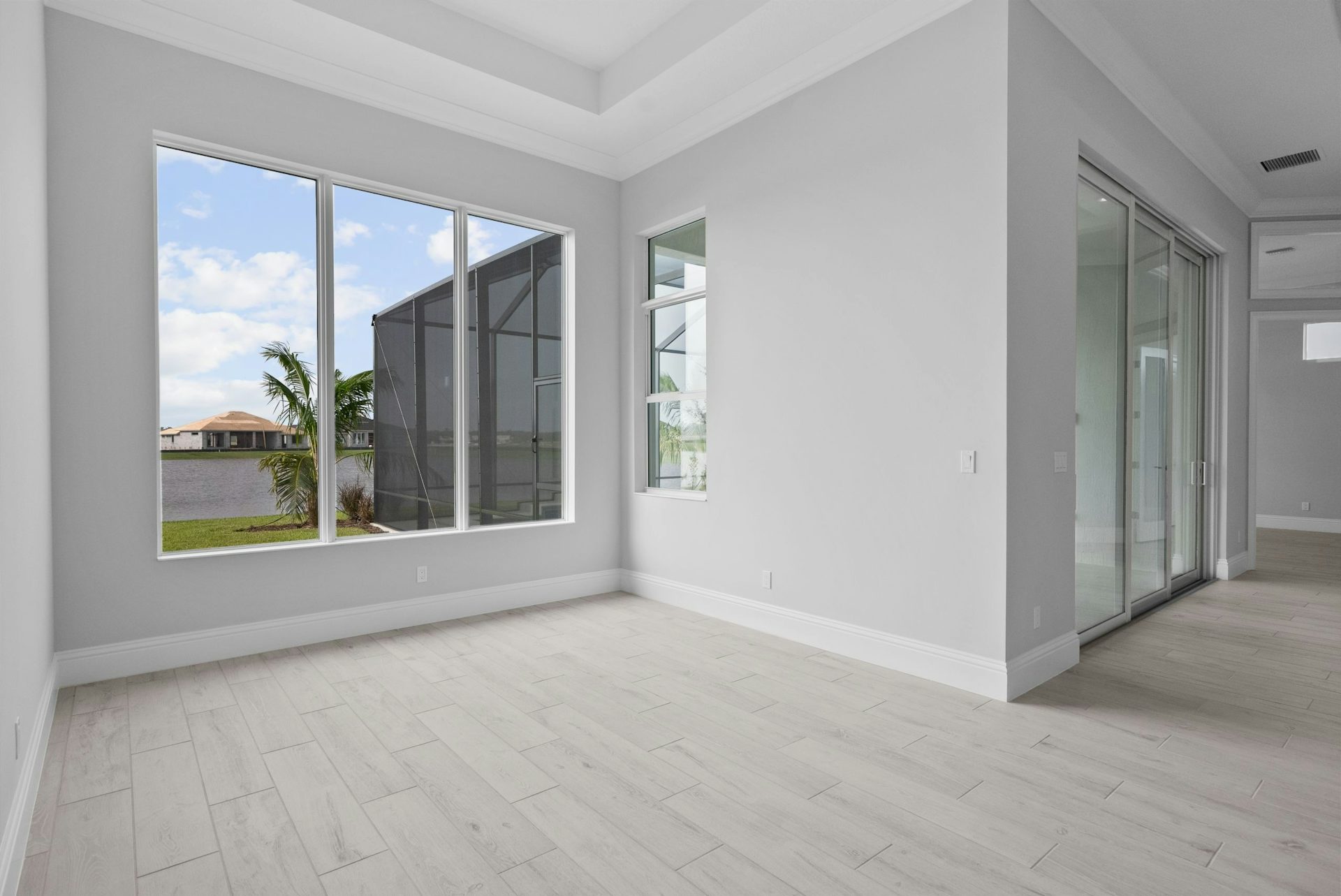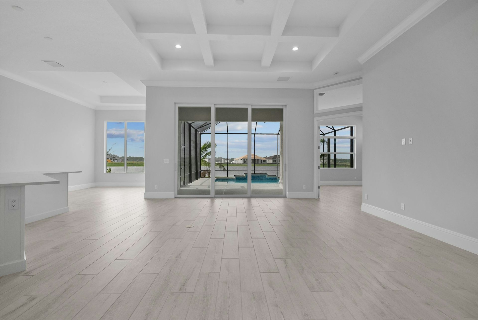 The Sage Grande floor plan is enhanced from the Sage plan featuring 3 bedrooms, 3.5 bath, a club room, and a two-car garage. The home boasts an open-concept design, ensuring privacy with bedrooms situated off independent hallways. At the heart of the home, the great room showcases high coffered ceilings and an expansive slider that floods the space with natural light, seamlessly connecting the indoors to the lanai. The kitchen is ideal for entertaining, equipped with a large counter-height island, quartz countertops, high-end appliances, and a spacious walk-in pantry. The dining area, adorned with large windows and a tray ceiling, enhances the home's welcoming and elegant ambiance.